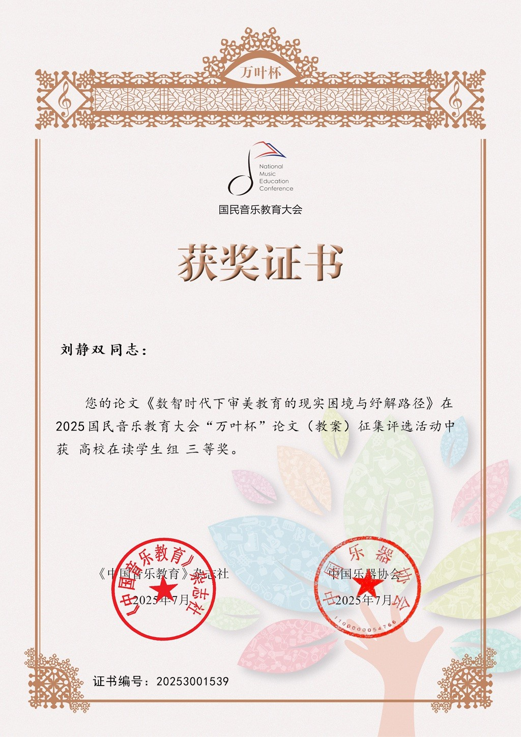 音乐教育方向24级硕士研究生刘静双(导师:胡碧瑜老师),《数智时代下审美教育的现实困境与纾解路径》。