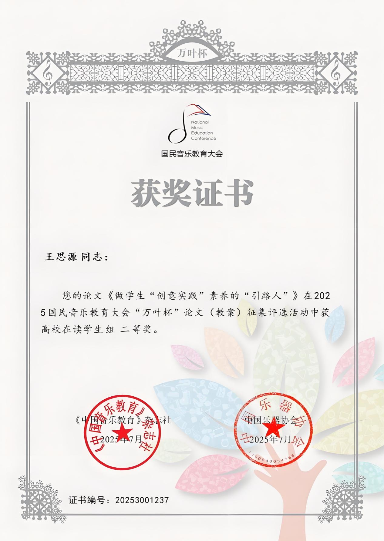 音乐教育方向24级硕士研究生王思源(导师:胡碧瑜老师),《做学生“创意实践”素养的“引路人”》。