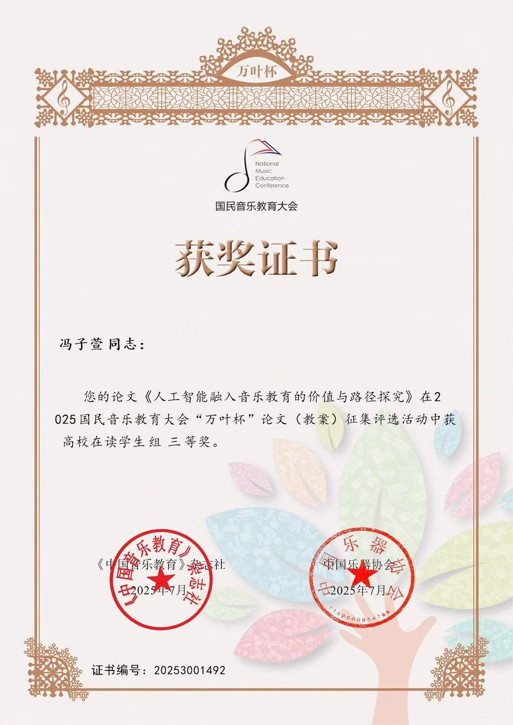 音乐教育方向24级硕士研究生冯子萱(导师:胡碧瑜老师),《人工智能融入音乐教育的价值与路径探究》。